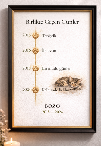 “Birlikte Geçen Günler” Anı Posteri, patili dostunuzla paylaştığınız en özel anları yıllara bölünmüş bir hatıra olarak saklamanızı sağlar. Tanıştığınız gün, birlikte oynadığınız zamanlar ve kalbinizde bıraktığı iz… hepsi bu özel tasarımda bir araya geliyor.
